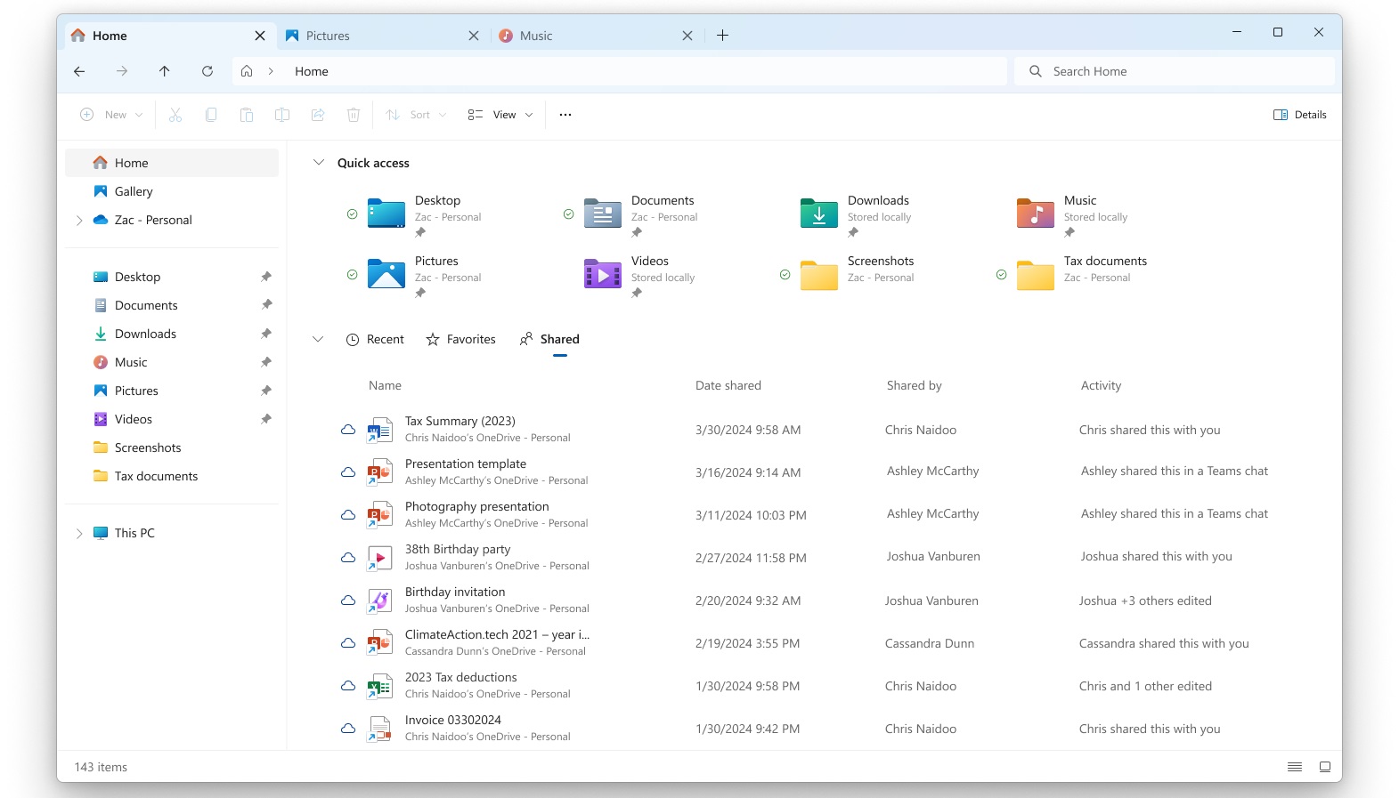 - File Explorer’s recommended section contains OneDrive files with links to upgrade/purchase OneDrive storage.