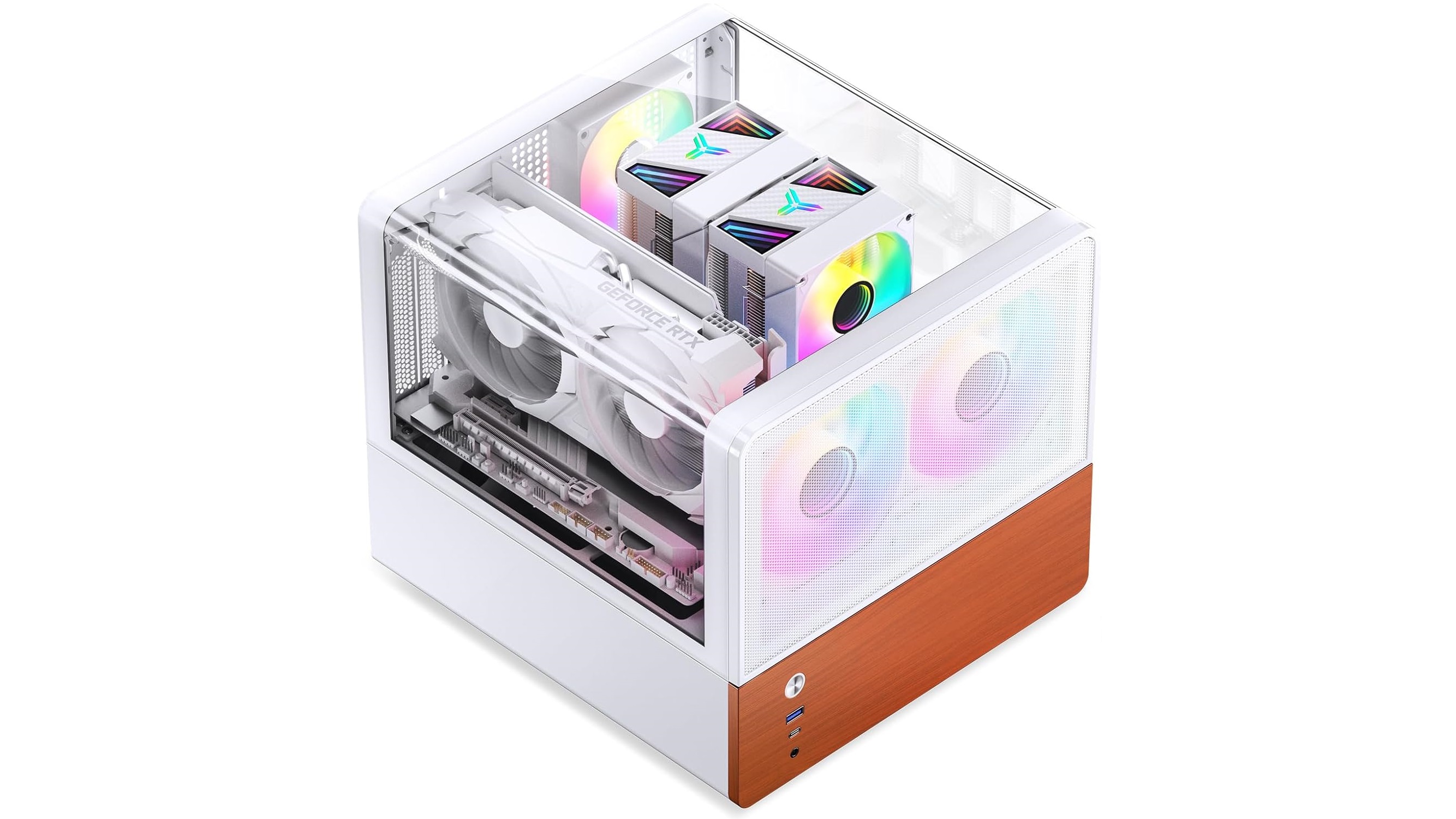The JONSBO V12 is one of the most unique compact cases on this list. It’s a dual-chamber case, and the PSU sits in its own chamber, which is separate from the rest of the components. Also, unlike a traditional compact case, where the motherboard is attached vertically, the motherboard sits on top of the top chamber. There’s glass on three sides of the case, and it looks fabulous.