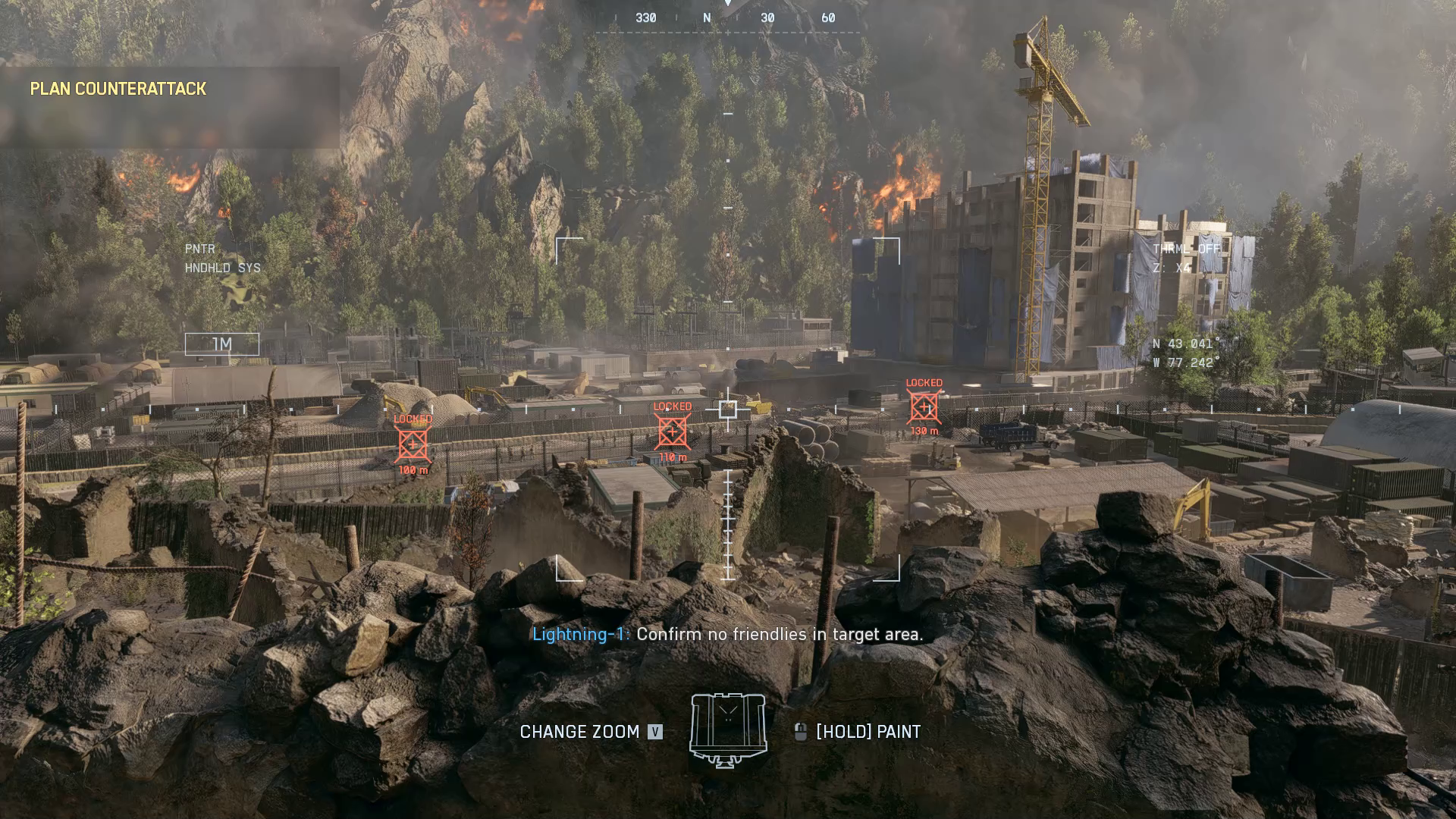 The game now directs you to use a laser designator to call in an airstrike from “Lightning 1” on Pax armored vehicles and artillery. This is vital, or you won’t be able to proceed to the next objective.