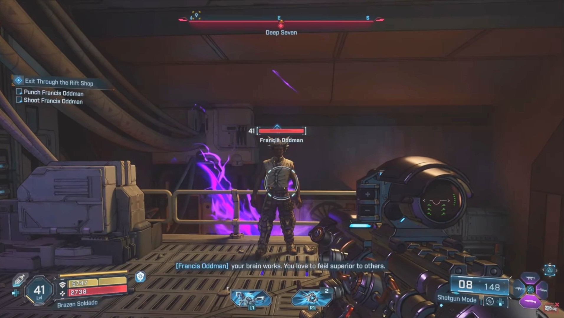 Believing in a paradise on the other side of the portals, Oddman sends you to get replacement parts for his damaged equipment. However, you will soon discover that Oddman hasn’t been entirely truthful with you. After completing all the mission tasks, the penultimate objective will be to “Confront Francis Oddman.”