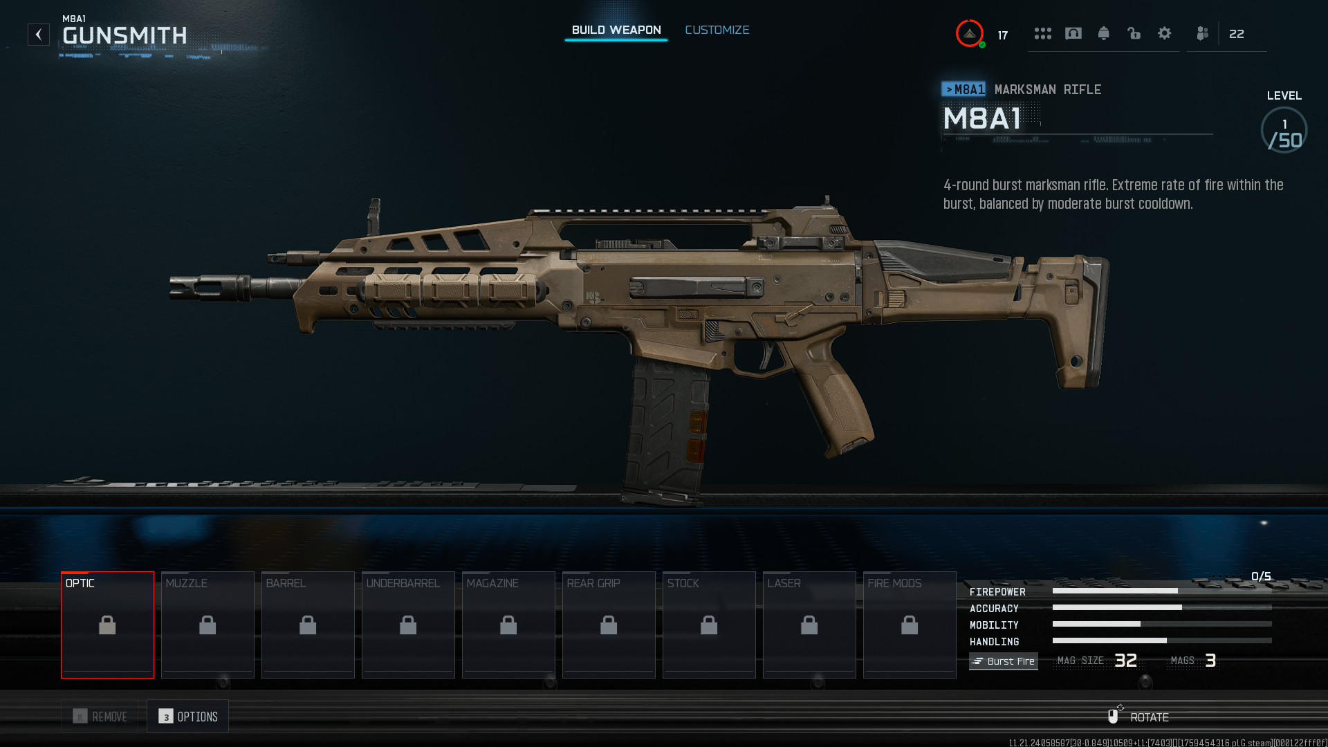 Note: Before setting up this build, you must have Custom loadouts unlocked. It is available at level 4, and the M8A1 itself is unlocked when you reach Corporal I (Level 7).