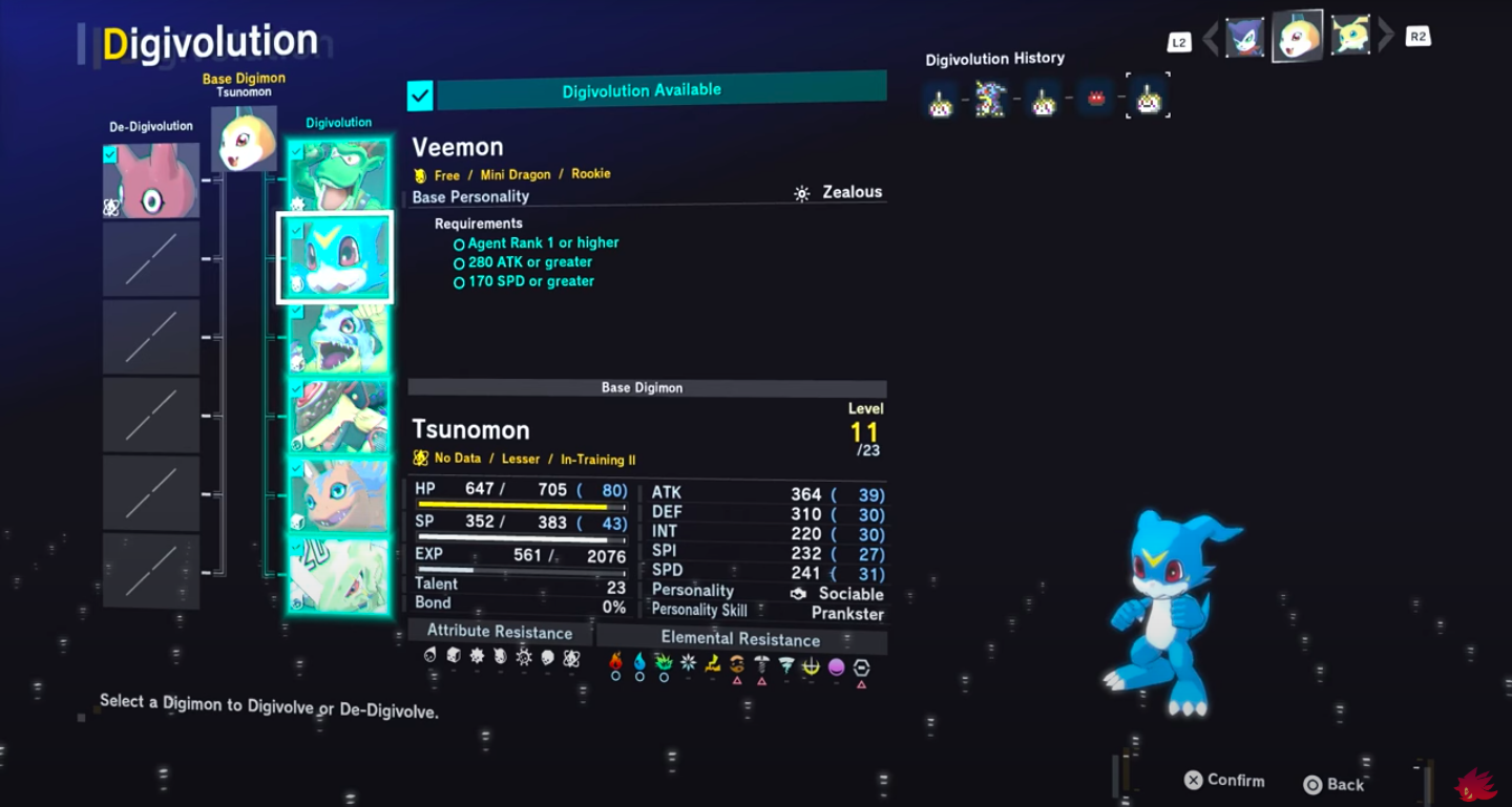 However, you do not need to worry about the Agent Rank, as Rank 1 is your default starting rank. The other two requirements are also fairly easy to manage after training Tsunomon for a short time. Once you have met all three conditions, go to the Digivolution menu to complete the process and obtain Veemon, along with its special move, Veemon Headbutt.