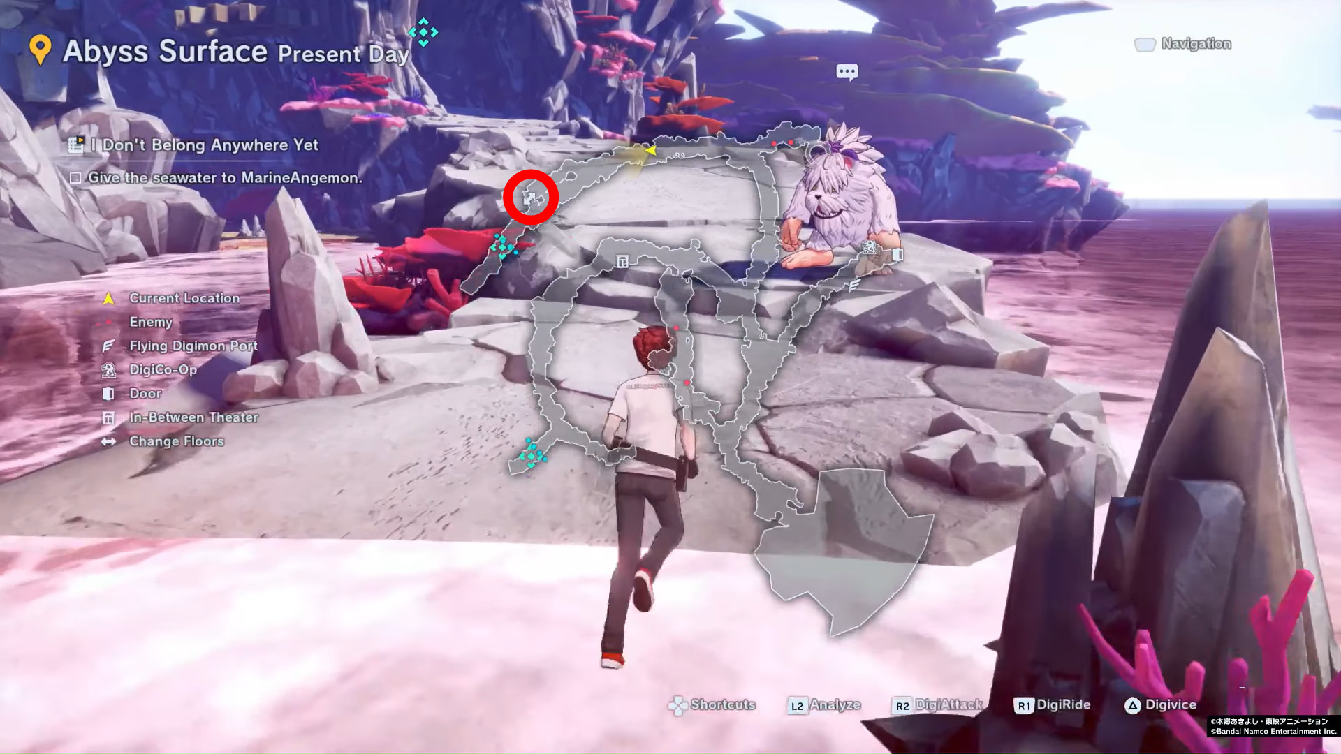 This can be found in the top-left corner of the Abyss Surface (marked on the image shown above). Once you fill the bottle there, a message will confirm that you have obtained clean seawater and can take it back to MarineAngemon.