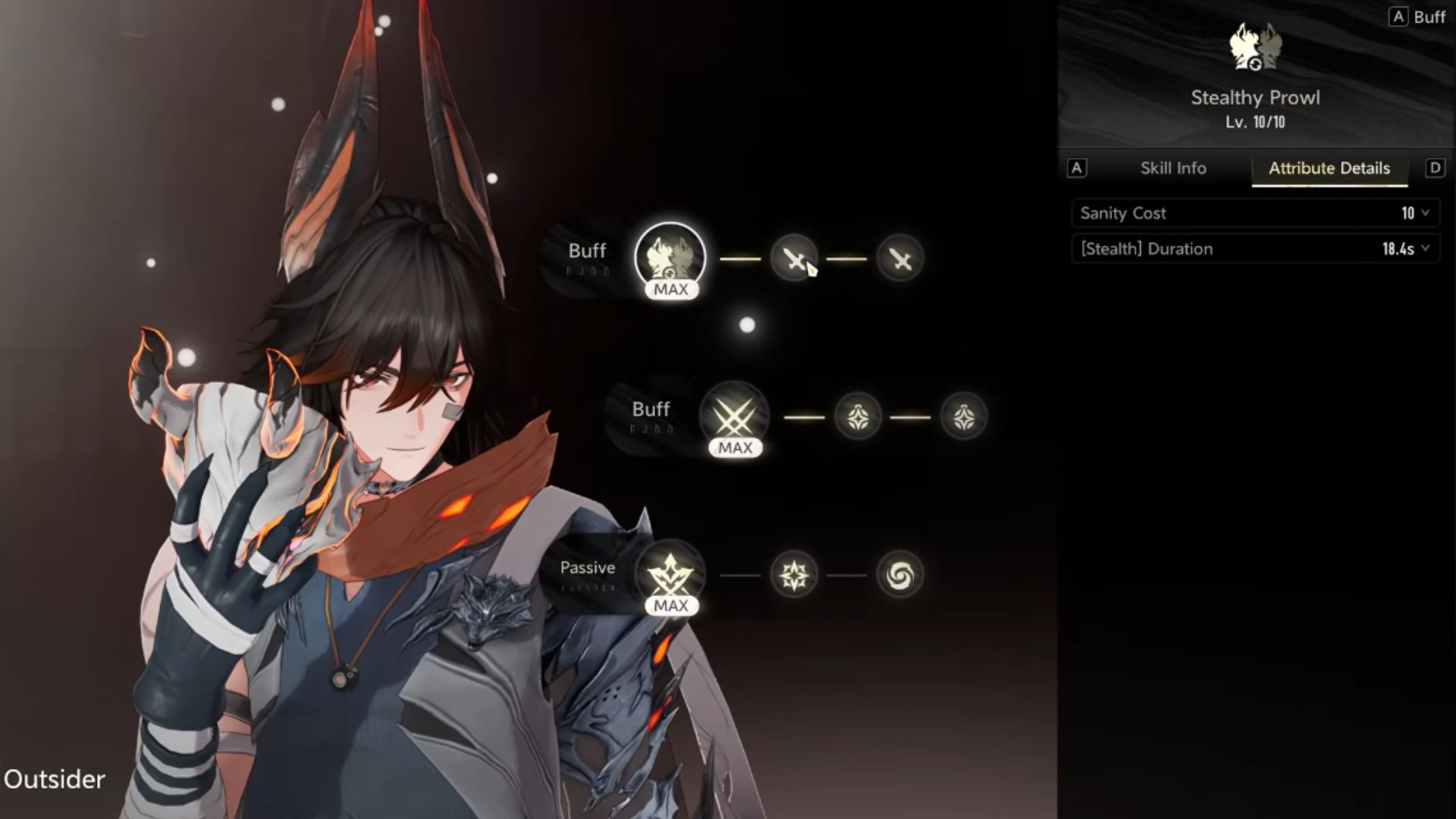 | Stealth | When in Stealth state, Outsider cannot be detected by enemies, and taking damage will not exit Stealth. Launching attack or using Predator’s Pounce will exit Stealth state. | Medium |