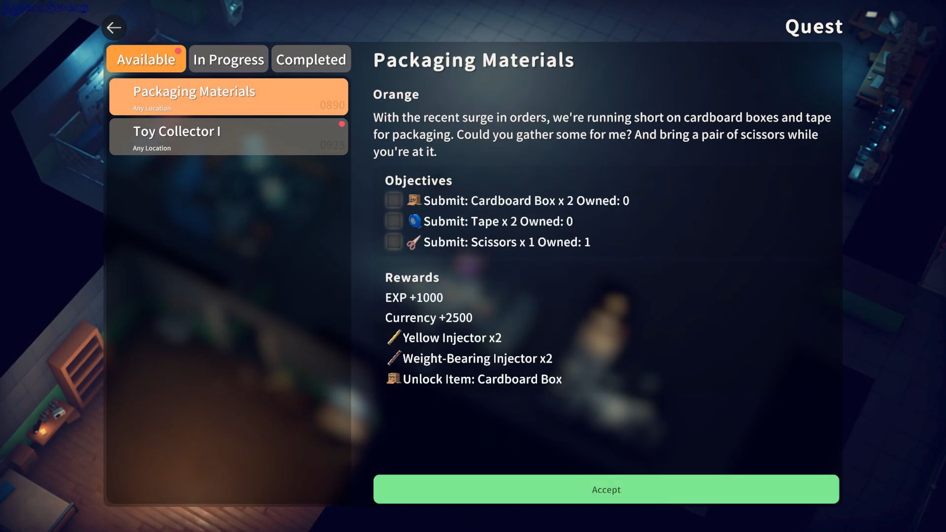 After completing the Packaging Materials quest, you unlock two additional missions and get some items, XP, and Cash as rewards. Here are the details of it: