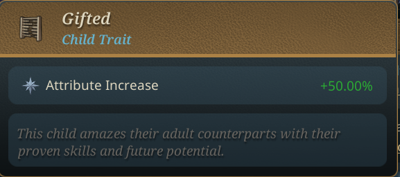 At the age of three, every child gains a single Child Trait at random, influencing their ability growth during education. For instance, a child with the Rowdy trait will gain an increased percentage of Military Abilities during their education.
