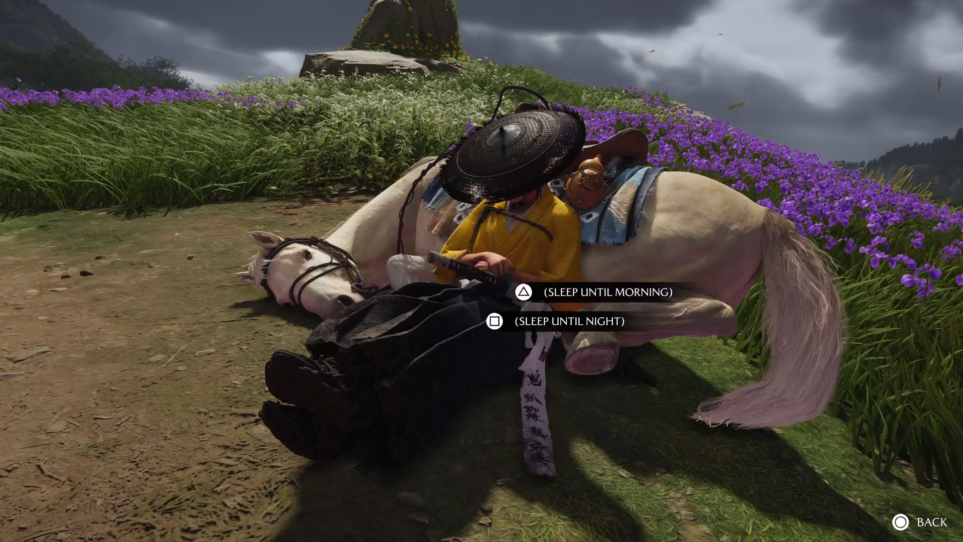 You can skip time in Ghost of Yotei by sleeping at your personal camp. Once you set up your camp in the wilderness, use the left joystick to point at your horse. You will get the option of Sleep Until Morning and Sleep Until Night. Select either and the in-game time will skip accordingly.