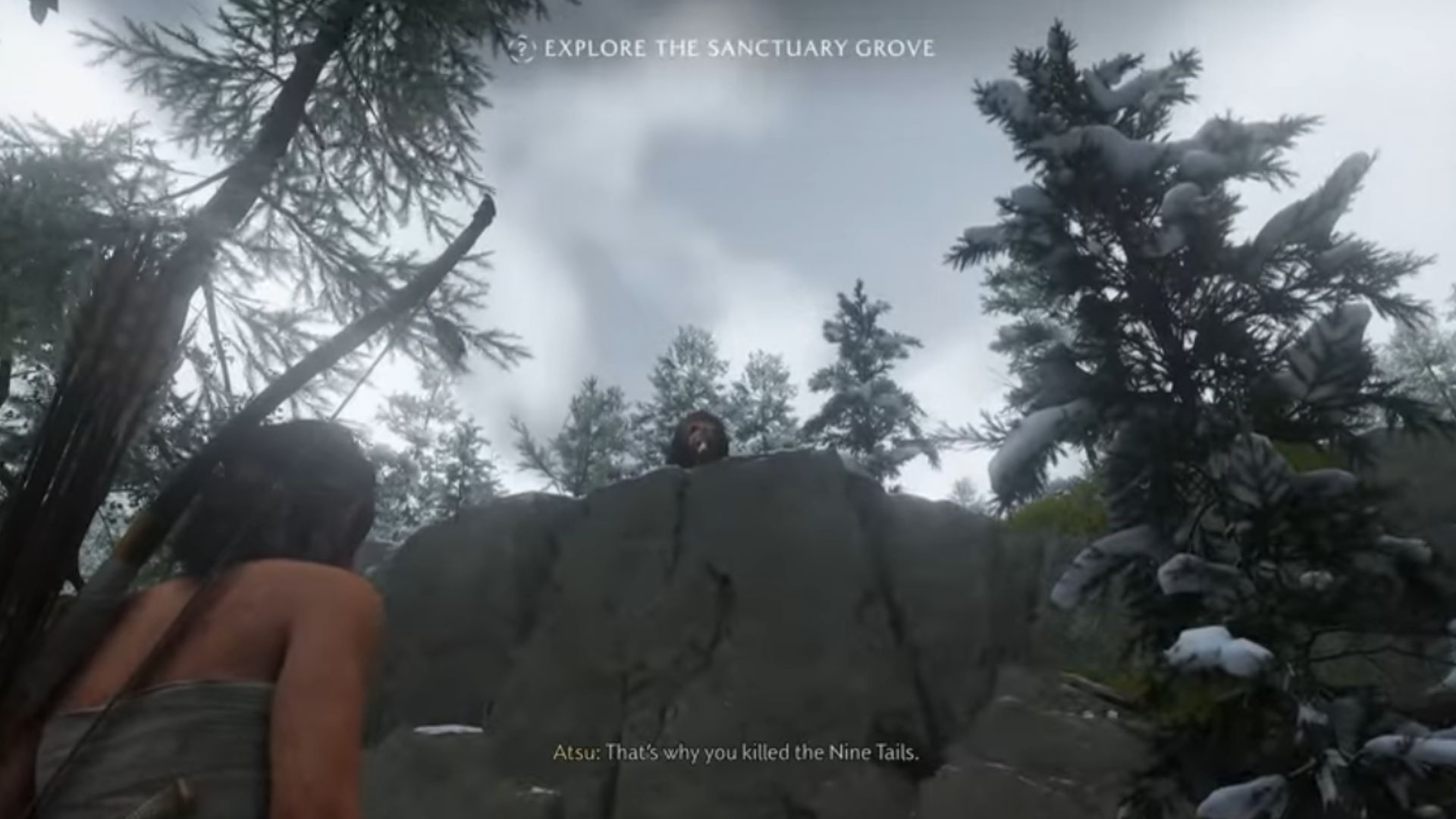 Pass through the secret entrance to discover the Hunting Camp Hideout. The Nine Tails here have been slain by some wild animal. Pass through this camp and free the fox in the cage. Make your way uphill, and you’ll discover a hidden sanctuary, the Sanctuary Grove, and a bear is prowling nearby. This bear won’t harm you, but it is the one that killed the Nine Tails for messing with its cub.