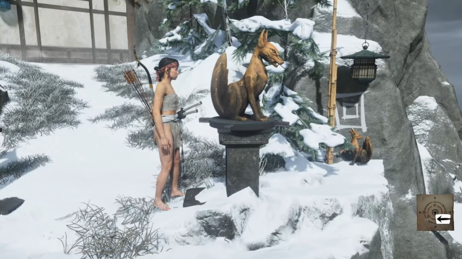 Once you have information on the Sarufutsu Lighthouse hideout, head out and cross the rope. Look to your left and you’ll see the lighthouse in the distance. That’s where you need to go. Head to the lighthouse and enter. You’ll find fox statues on the two walls to your sides. Make the bigger statues face the smaller ones in the middle to unlock the statues. Place the two smaller statues on the pedestals to unlock a secret path.