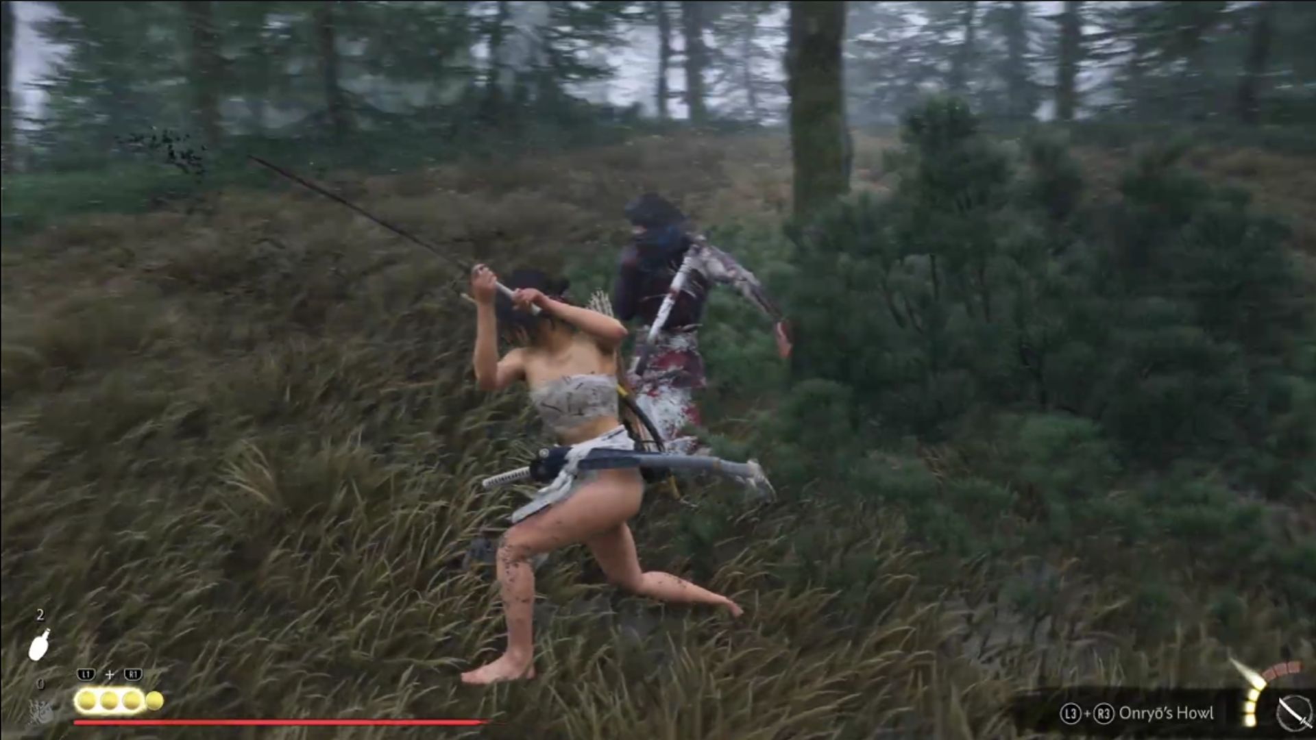 Walk up to the body and press R2 to investigate. Thankfully, the body isn’t Tadakichi’s. Before you can take this information in, an arrow comes flying, and another ambush comes your way. Kill the Nine Tails, and then resume the search.