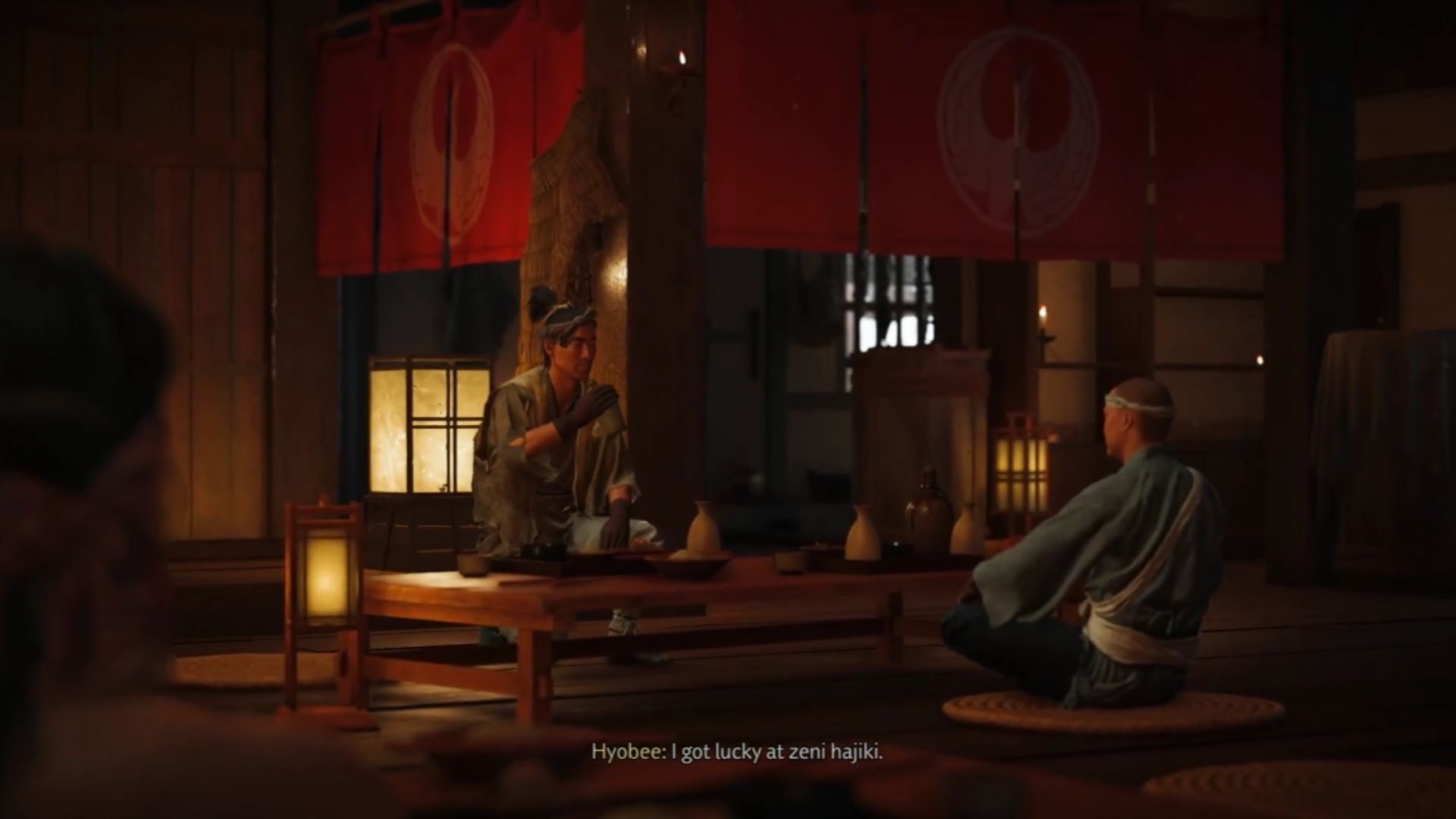 Head to the Red Crane Inn and get indoors. The inn is busy, but there is an empty table right in front you can sit at. Sit at the table and begin eavesdropping. You’ll hear Hyobee speak to another about a game of zeni hajiki that he won, the money from which he now wishes to use to move out of the area.