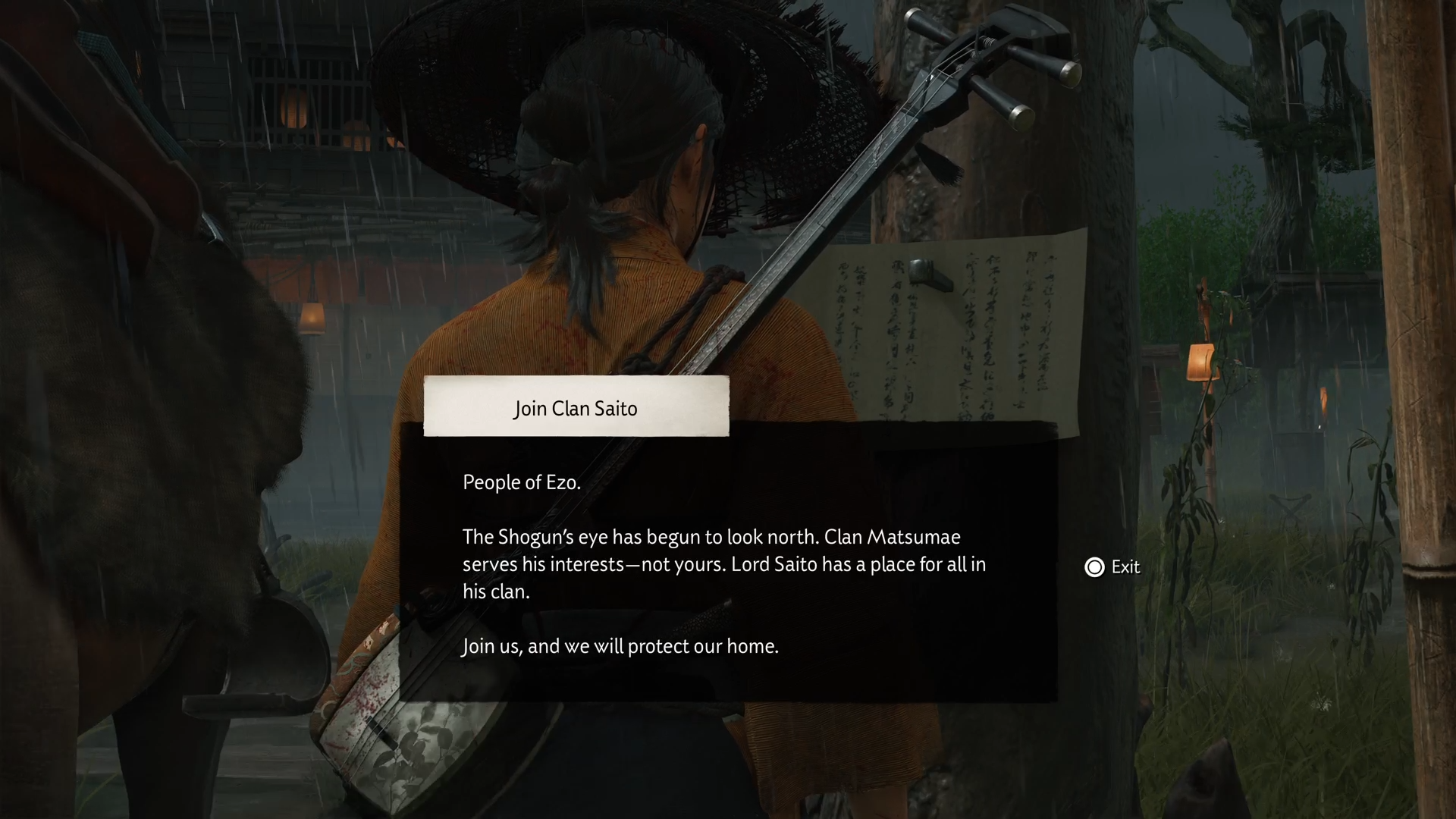 “The Shogun’s eye has begun to look north. Clan Matsumae serves his interests – not yours. Lord Saito has a place for all in his clan. Join us, and we will protect our home.”