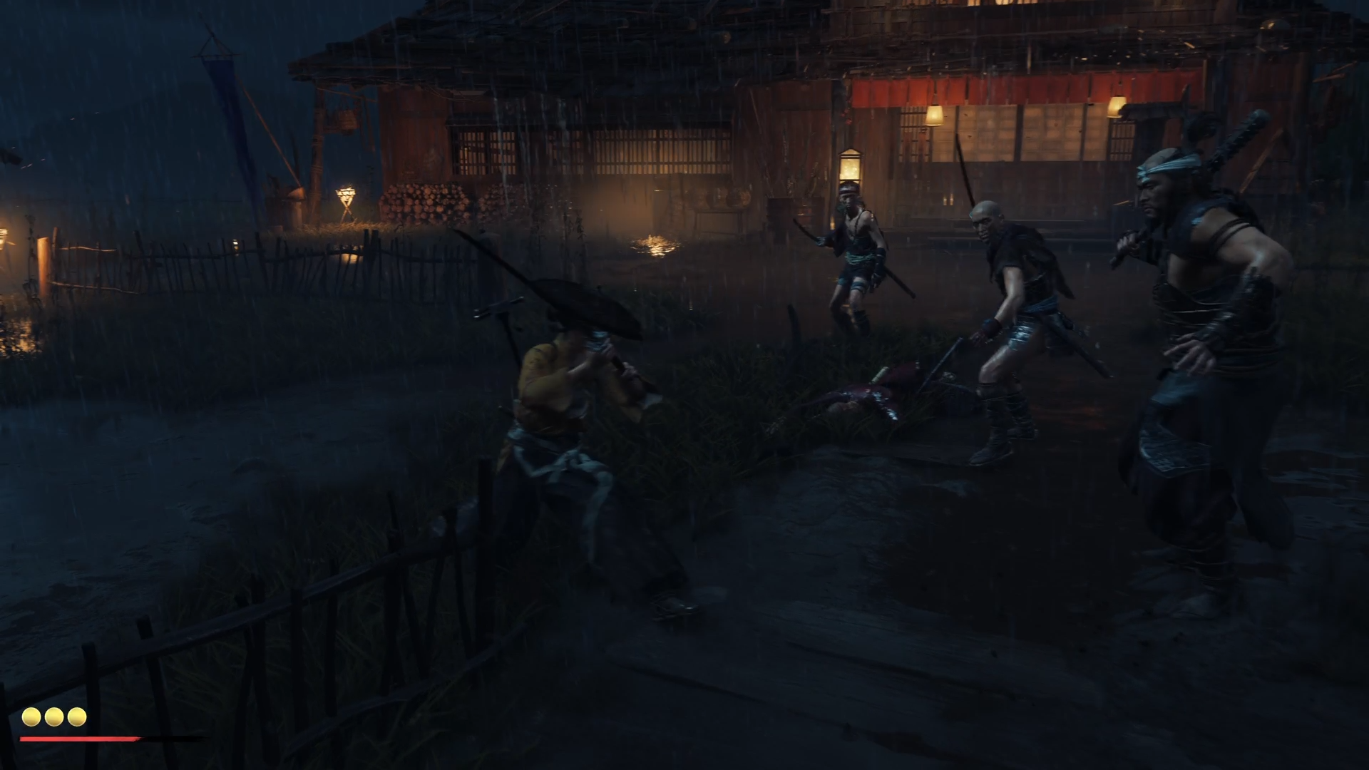 You can trigger a Standoff right at the beginning with L1. You are advised to do so to get an easy kill. Apart from one Brute, the rest of the enemies are using katana. Brute’s attacks are red-glints, meaning you need to dodge them. Take them down in any order you please, although I prefer to kill the others first and finally deal with the Brute. You can pick up a fallen weapon and throw it at the Brute to break his stride.