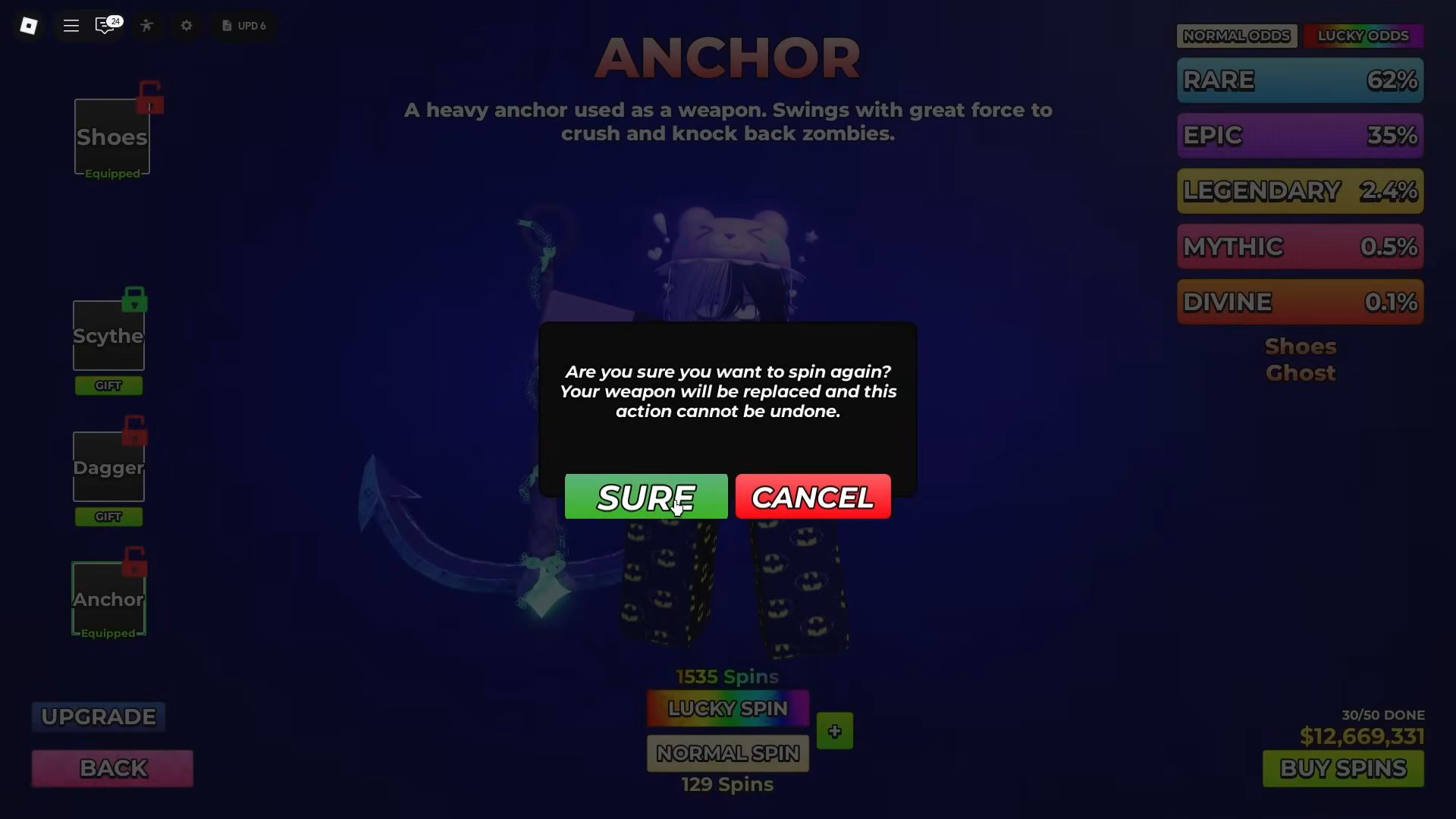 The Ghost weapon isn’t just rare, it’s insanely strong. When equipped, a spectral aura appears behind your character, holding a ghostly katana that slices through enemies. Its damage output and design easily make it one of the most powerful Divine weapons in Hunty Zombies.