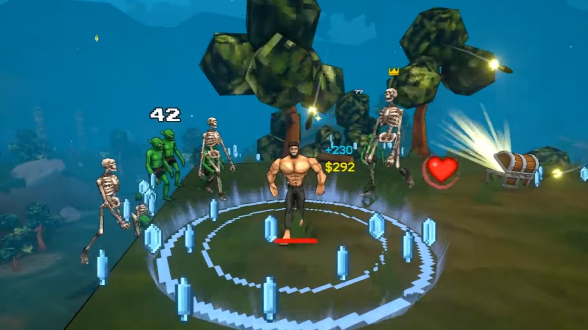 The best weapon you could put on Megachad is Aura. Aura is like a tornado force field that surrounds your character. This field deals damage to all who come close enough to you. Since Megachad is a tank, you can use his impressive survivability to simply bum rush enemies, tank their hits, and use Aura to dish out damage. You can also switch out Aura for the Axe for higher damage. Still, we believe that the former synergizes best with the tank nature of the character.