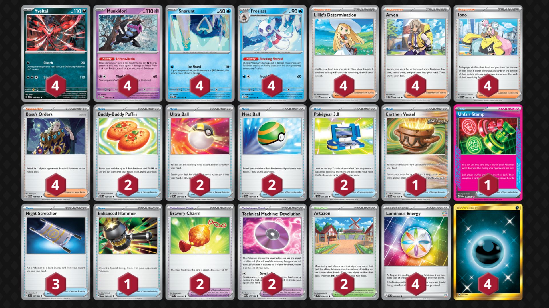 The plan with this deck is simple. Yveltal uses its move Clutch to prevent the opponent from retreating. While locking the Defending Pokemon in place, Munkidori and Froslass will chip away at them with the help of their abilities.