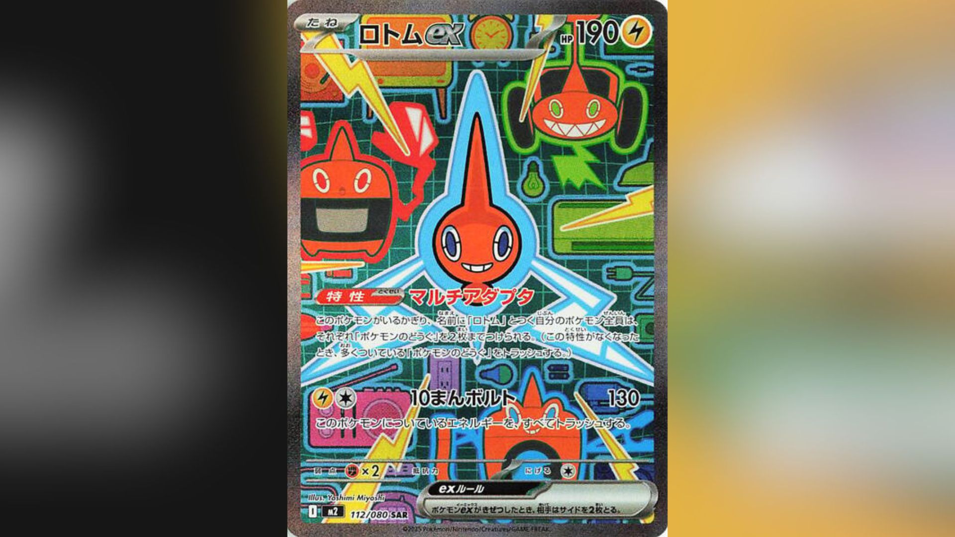Rotom ex is a surprising Chase Card from this set. The card is, of course, gorgeous, as we get to see base Rotom with Rotom Heat, Rotom Wash, and Rotom Mow in the background. There’s also a bit of a retro tech vibe to the card, which suits this Pokemon well. It has some interesting competitive aspects as well; when it’s in play, all Rotom cards can hold two Pokemon Tools thanks to its ability, Multi-Adapter.