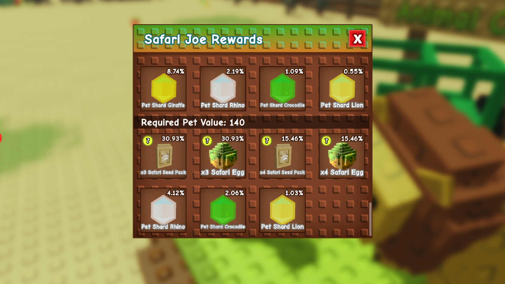 As of the current patch, you can only get the Pet Mutation Shard Crocodile as a potential reward from Safari Joe, an NPC who visits every hour for ten minutes. Players can submit their pets to get corresponding rewards. The pet’s rarity, age, and mutations determine which tier of rewards you get.