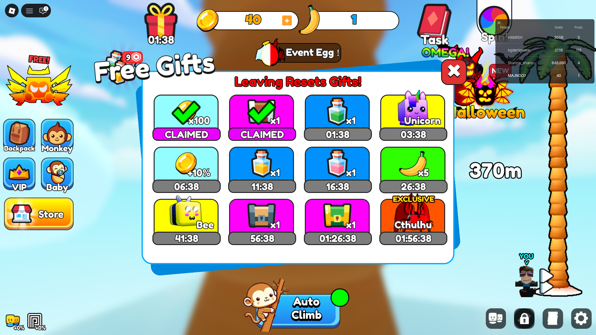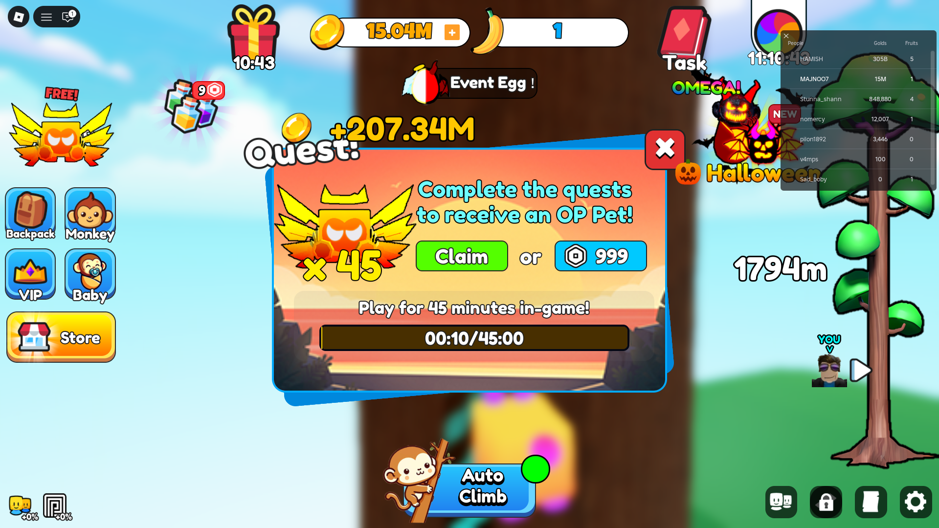 In Monkey Climb on Roblox, you play as a monkey who has to scale really tall trees. Doing so gives you coins, with which you can buy faster climbing monkeys and even pets. Pets are basically coin multipliers, with rarer ones giving a bigger bonus. The goal is to earn enough money to evolve your monkey into a powerful climber.