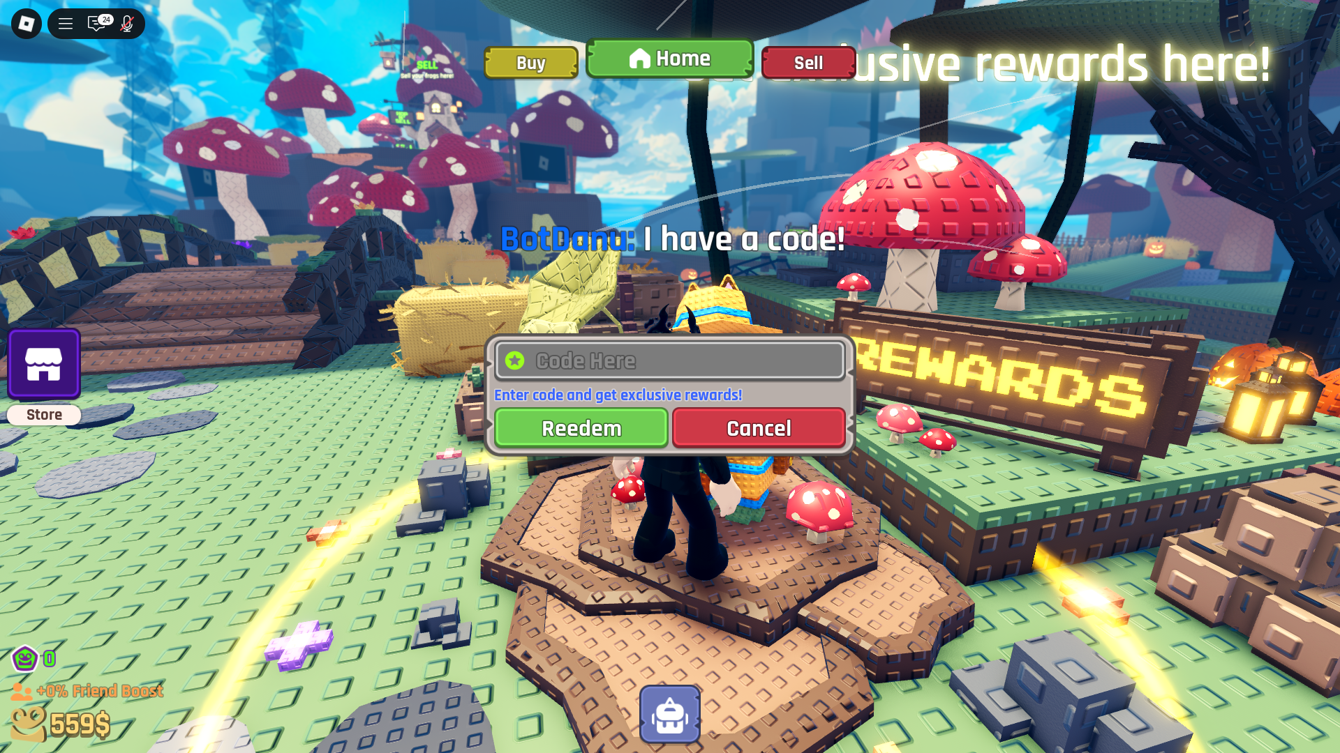 Talk to the Rewards NPC on the central island, choose “I have a code,” and enter your code to claim rewards.