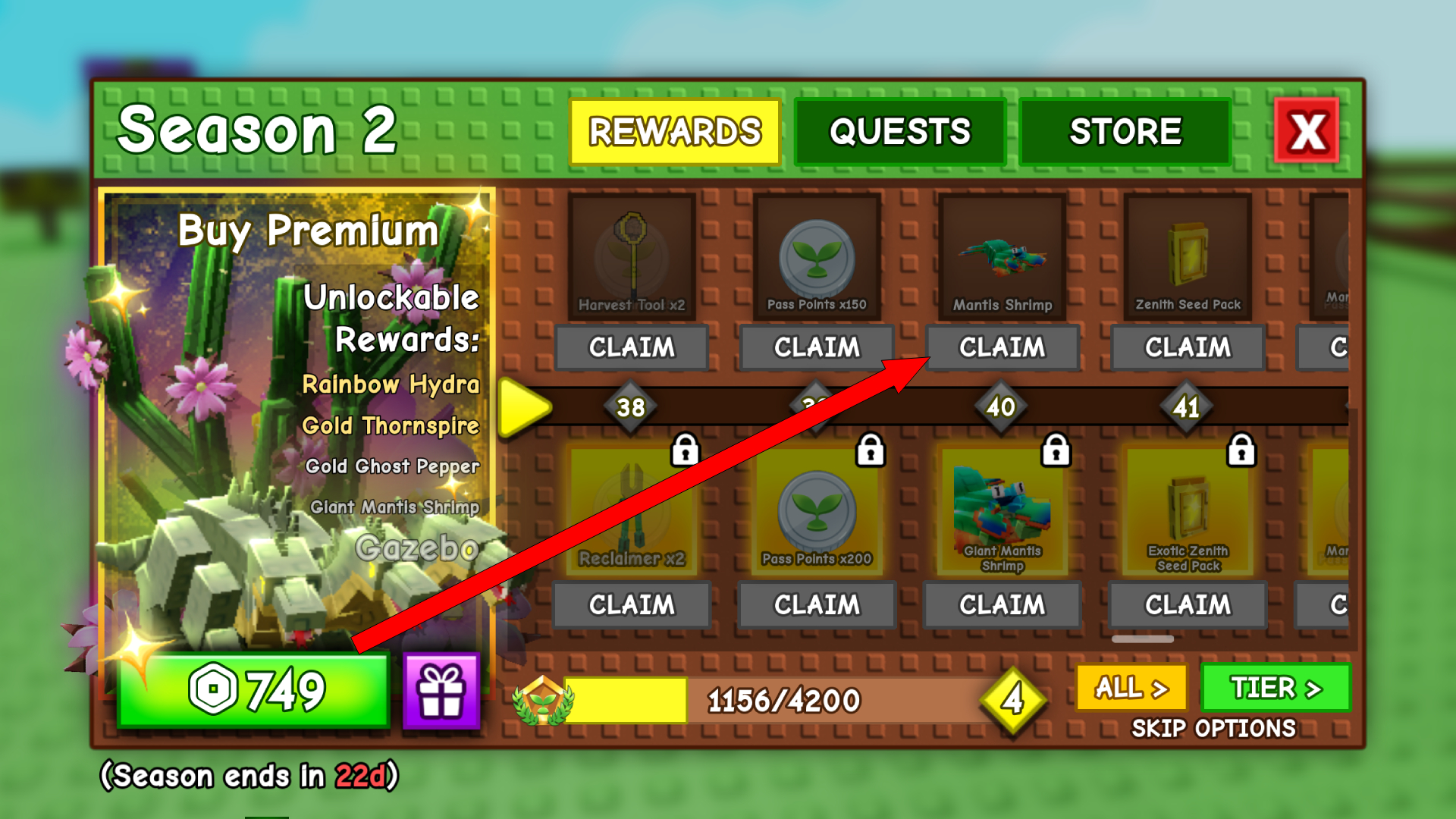 The best way to get to level 40 of the Season 2 Pass is to target the active quests in the Pass Menu. These refresh every 24 hours, and give you ample XP to reach not only the Mantis Shrimp but also other rewards in the past, which include other pets such as the Hydra. Harvesting plants also nets you XP, with rarer fruits such as Divine and Transcendent ones giving you more XP. After reaching level 40 in the Season 2 Pass, you can go to the Pass Menu and claim the Mantis Shrimp pet for your own. It will appear in your inventory.